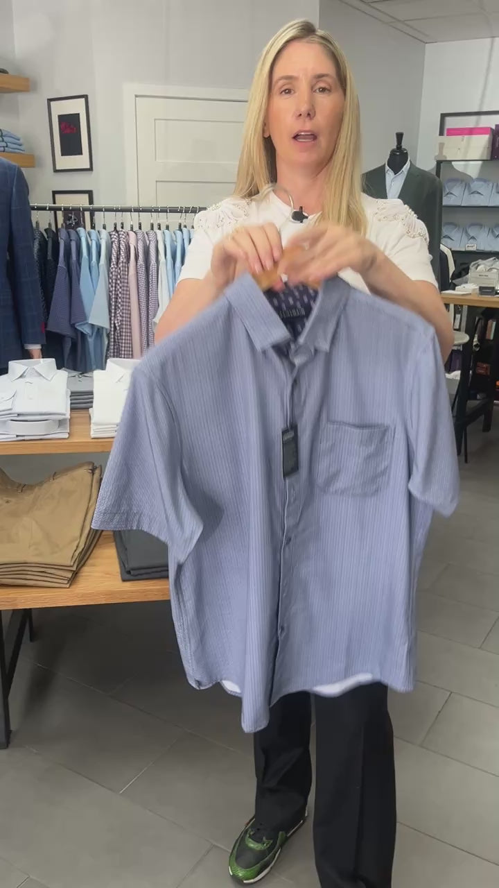 Mizzen + Main makes the best short sleeve shirt for men.  It's a trim fit but not too tight.  This shirt is a blue mini geo print. Very wearable and can be worn with blue, grey, khaki, black, etc bottoms. From shorts to slacks.  Try this short sleeve shirt.   It will be your new favorite short sleeve shirt.
