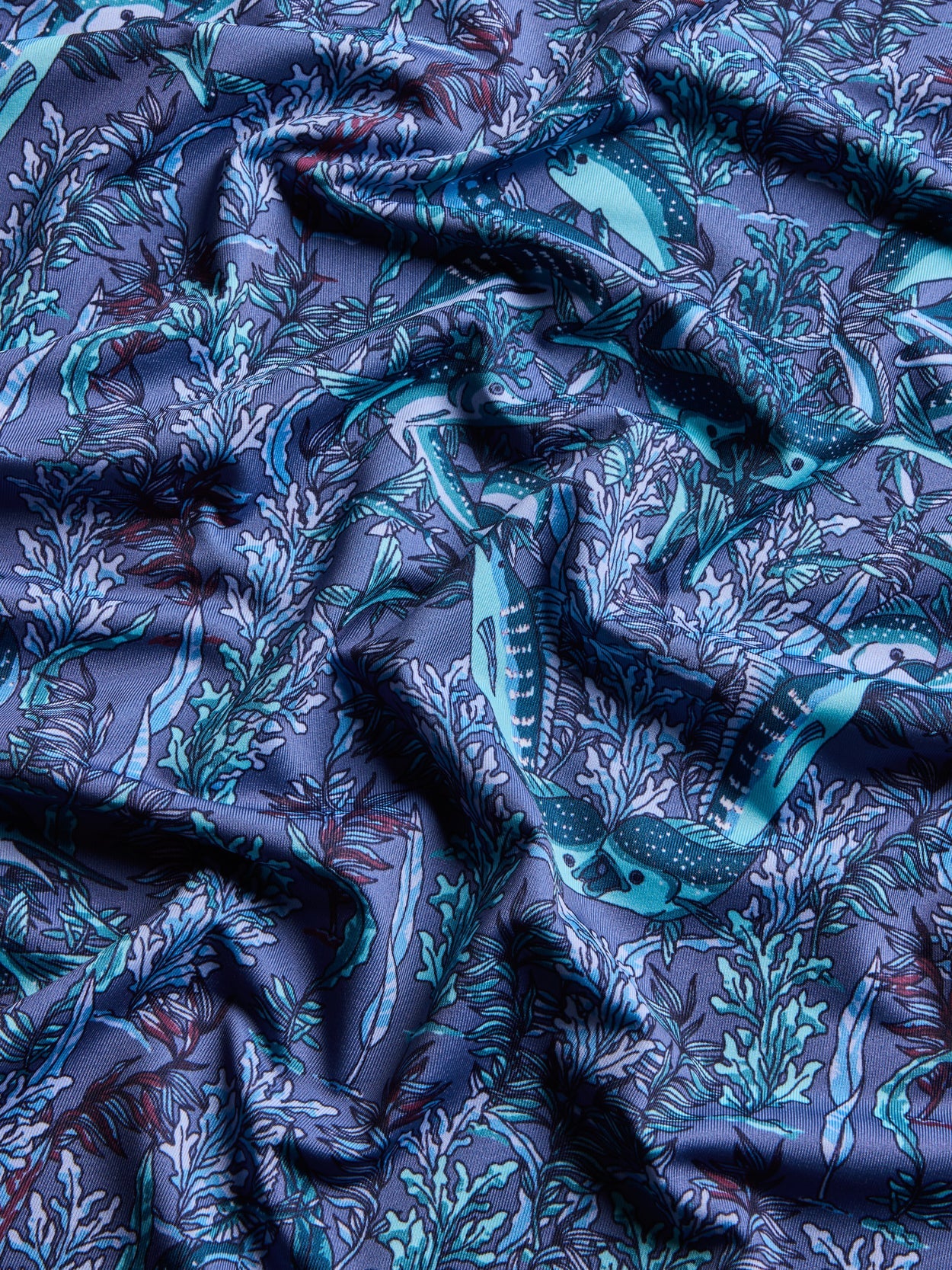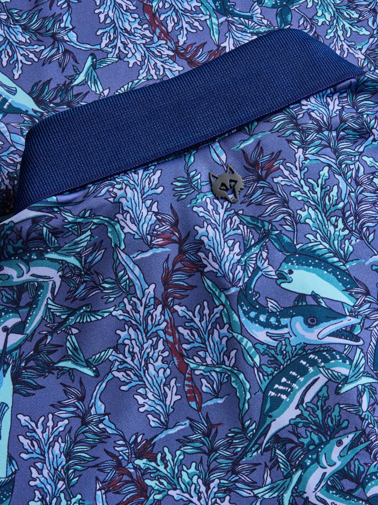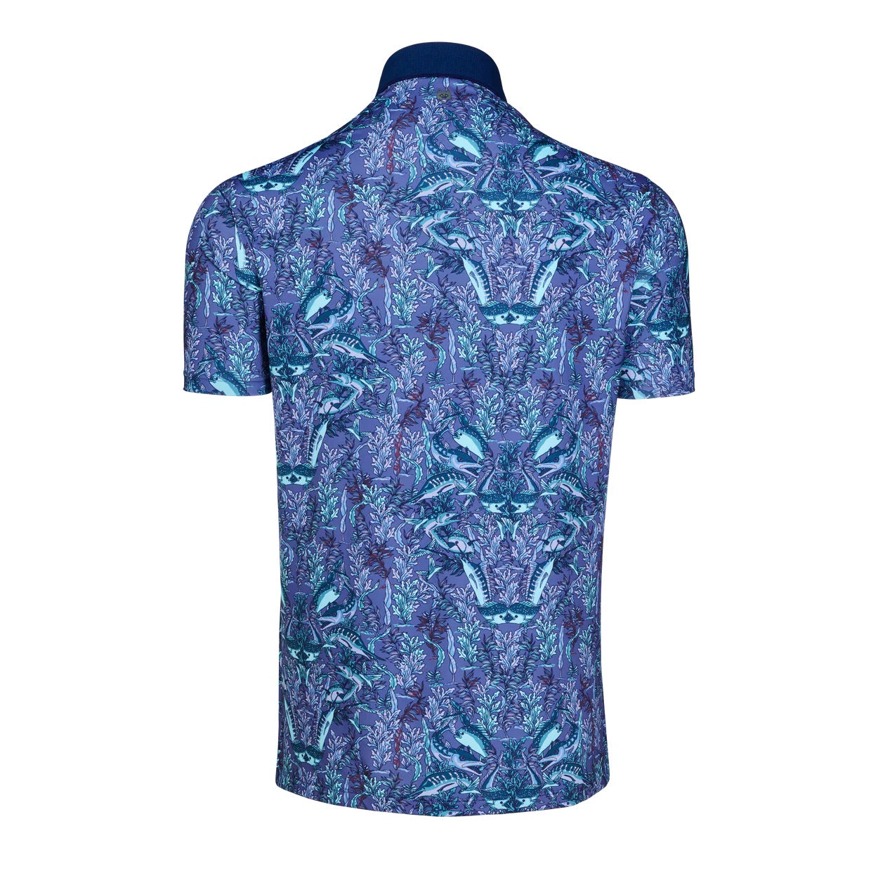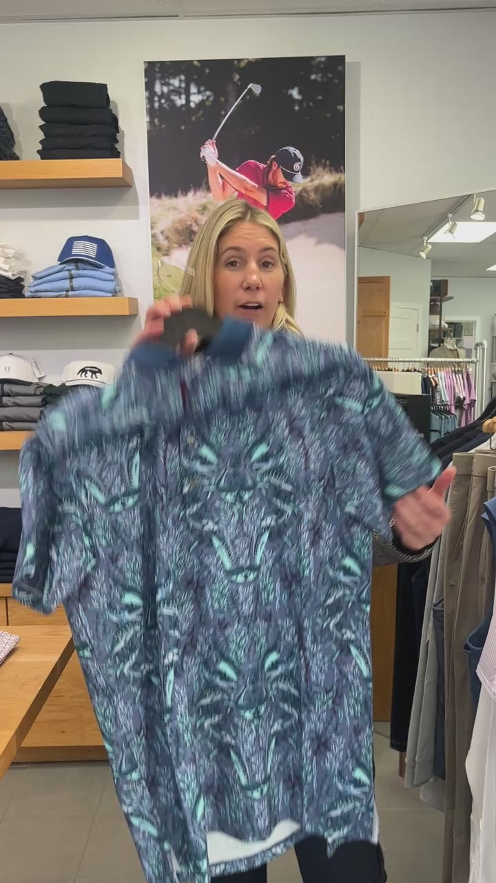 Performance men's polo with knit collar. The Marlin Curiosities Short Sleeve Polo stands out with a bold, graphic print built from layered, symmetrical patterning, balanced by refined construction. Crafted from a lightweight technical fabric, it offers breathable comfort with moisture wicking and quick drying performance suited for warm conditions. A yarn dyed knit cutaway collar and clean placket add a sharp, elevated finish to the silhouette. Built in stretch and UV protection support ease of movement, making it an easy option for golf, workdays, casual wear, and travel.
