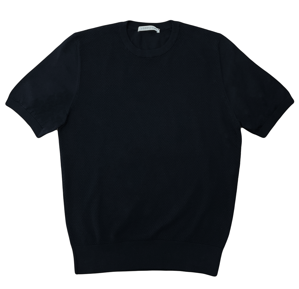 This Navy Short Sleeve Crew by Lorenzoni features a sleek, sophisticated design with textured front and sleeves. The fabric is a high-quality tricot blend, woven with a waffle-like knit for added dimension. The back showcases a smooth, 1x1 rib knit for a polished finish.