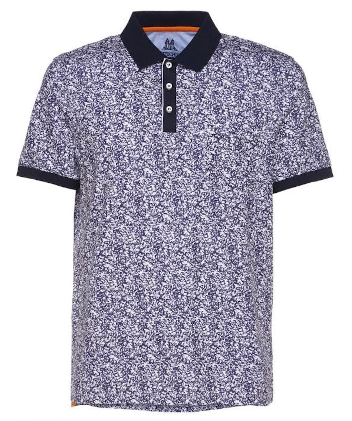 This navy white polo by Montechiaro boasts an all-over navy blue flower print. The navy blue ribbed collar and ribbed cuffs on the short sleeves add to its sophisticated appeal. Made in Italy, this polo stays true to European sizes, so we suggest sizing up from your usual size. Whether you prefer a dressier polo for non-golf occasions, this brand offers a great option. You can pair it with jeans, slacks, or your go-to shorts and wear it tucked or untucked.